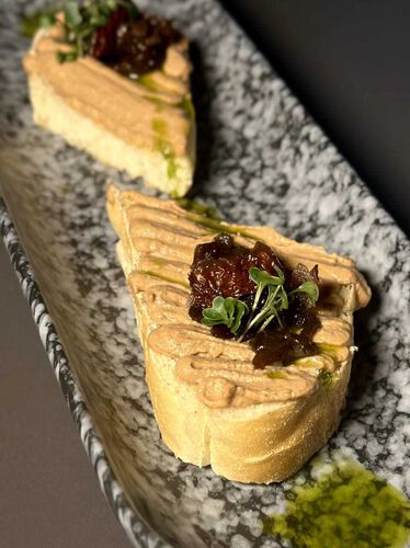 Телячьи щёчки, красное вино, морковь, лук, томатная паста, картофельное пюре, зелень, зелёное масло