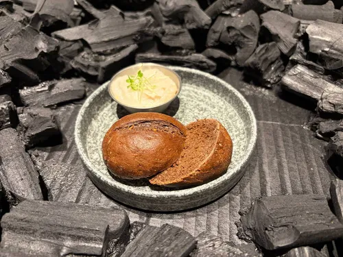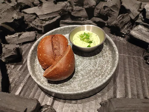 Мидии в створках, белое вино, чеснок, оливковое масло, морковь лук порей, зелень, куриный бульон, чиабатта, зелёное масло.