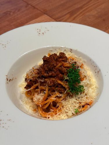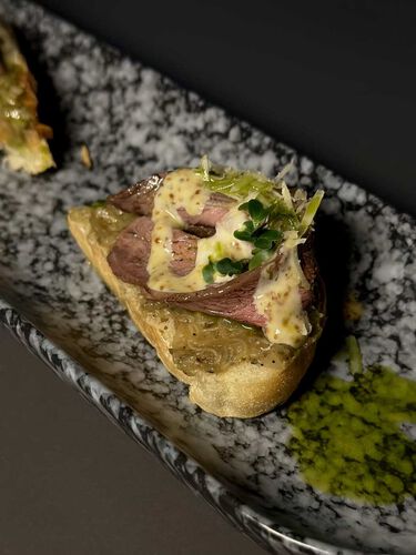 Томлёные в красном вине со специями и овощами телячьи щёчки, подаются с картофельным пюре