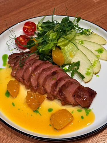 Утиное филе, апельсины, апельсиновый сок, коньяк, груша, томаты черри, микс зелени
