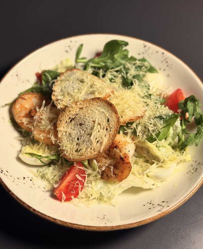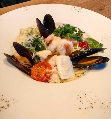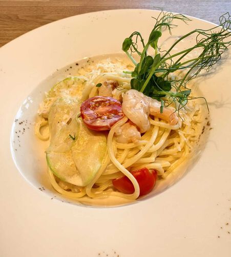 Спагетти, обжаренные креветки, сливки, пармезан, томаты черри, цукини, зелень