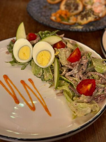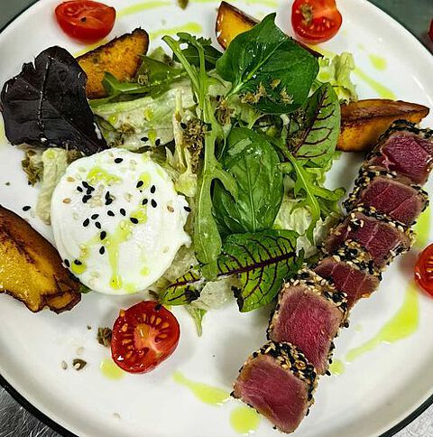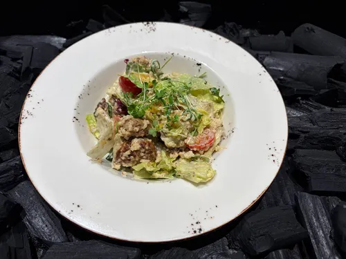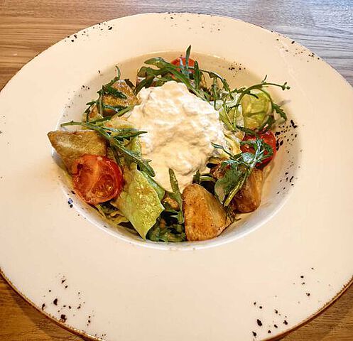 Баклажаны обжаренные, томаты черри, микс зелени, сыр страчателла, соус (чеснок, сладкий чили, соевый соус и оливковое масло)