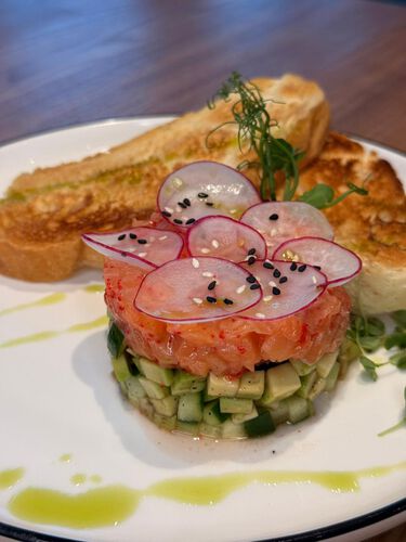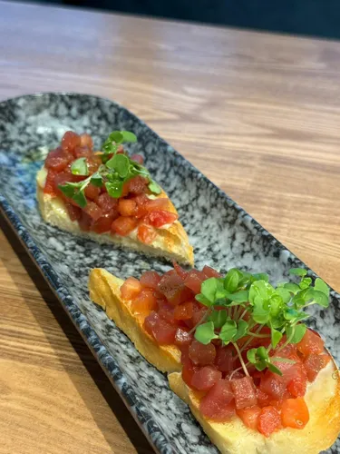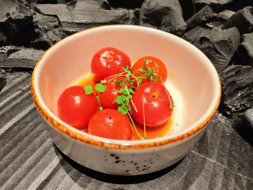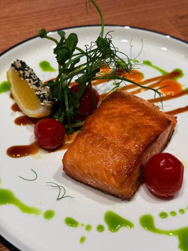 Красная рыба, обжаренные томаты черри, зелень, лимон, зелёное масло, соус терияки