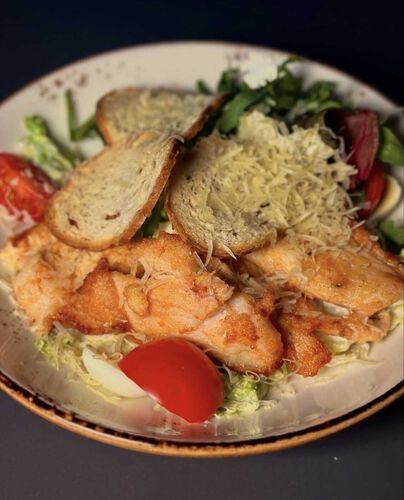 Стейк из куриного филе, подаётся со шпинатом в сливках с трюфельным маслом и обжаренными вешенками: