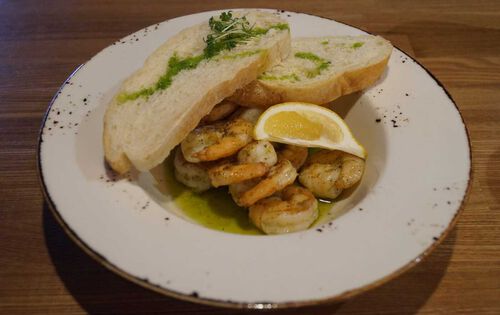 Креветки, чеснок, оливковое масло, петрушка, лимон, чиабатта, зелёное масло