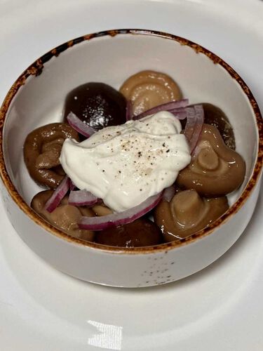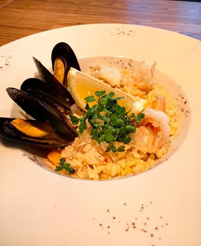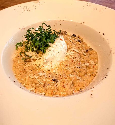 Ризотто в сливочном соусе с белыми грибами и шампиньонами, подается с творожным сыром.