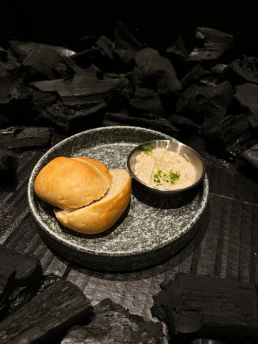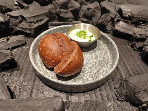 Мидии в створках, белое вино, чеснок, оливковое масло, морковь лук порей, зелень, куриный бульон, чиабатта, зелёное масло.