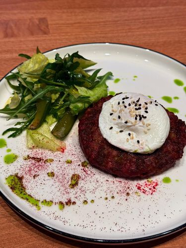 Телячьи щёчки, красное вино, морковь, лук, томатная паста, картофельное пюре, зелень, зелёное масло