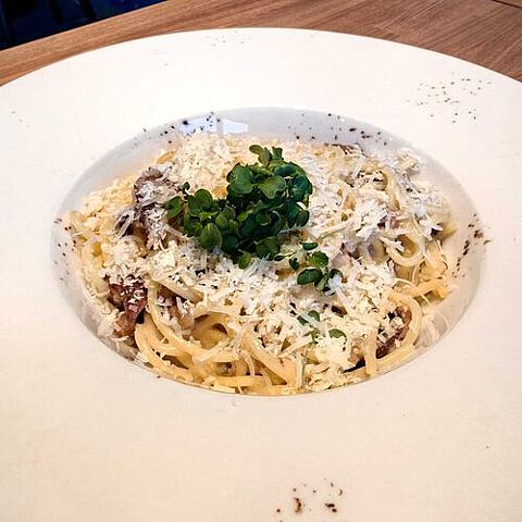 Спагетти, обжаренные креветки, сливки, пармезан, томаты черри, цукини, зелень