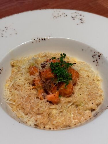 Птитим, сливки, молоко кокосовое, пармезан, цукини, красная рыба, белое вино, зелёное масло, зелень