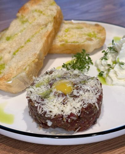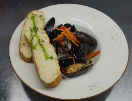 Мидии, томлённые в соусе на основе белого вина с чесноком, с добавлением овощей, подаются с чиабаттой