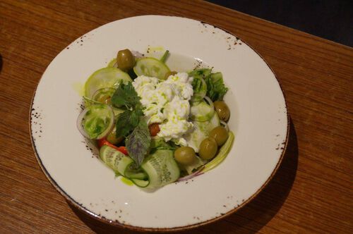 Баклажаны обжаренные, томаты черри, микс зелени, сыр страчателла, соус (чеснок, сладкий чили, соевый соус и оливковое масло)