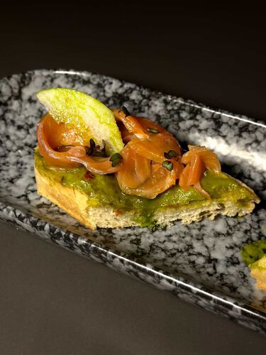 Красная рыба, обжаренные томаты черри, зелень, лимон, зелёное масло, соус терияки
