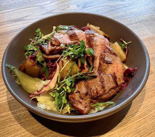 Утиное филе, апельсины, апельсиновый сок, коньяк, груша, томаты черри, микс зелени