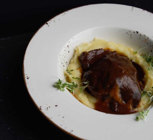Томлёные в красном вине со специями и овощами телячьи щёчки, подаются с картофельным пюре